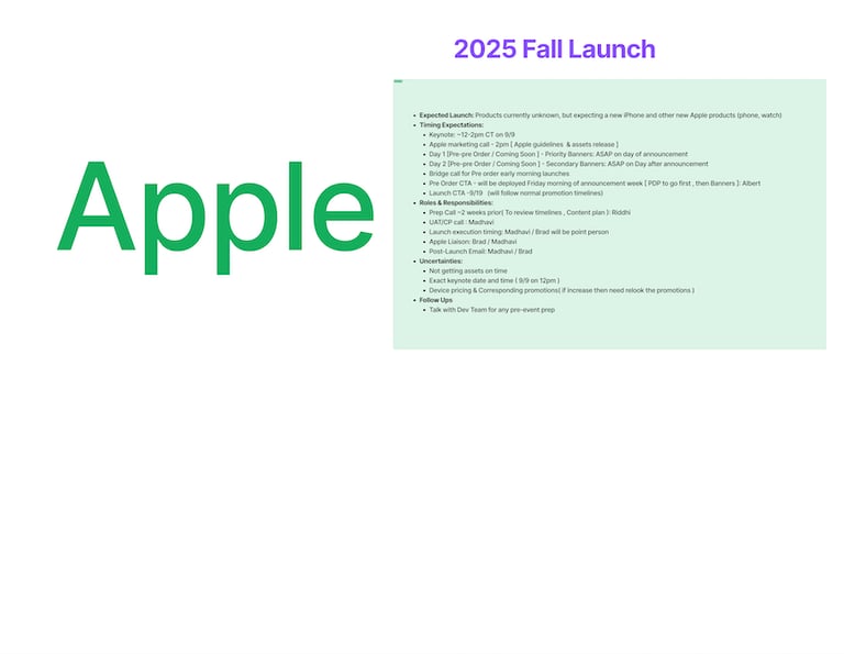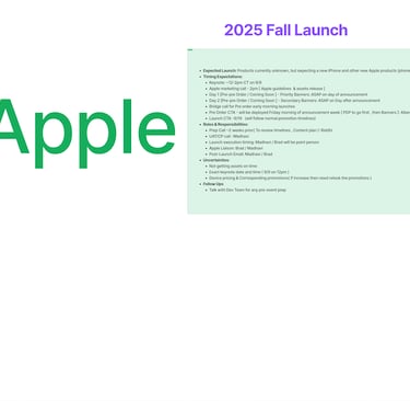 I worked at the intersection of strategy, design, and operational planning, translating Apple’s confidential launch information into a clear internal roadmap for execution.