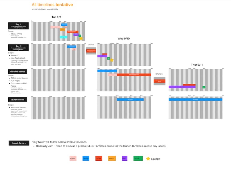 The timeline mapped the entire Apple launch lifecycle, including: